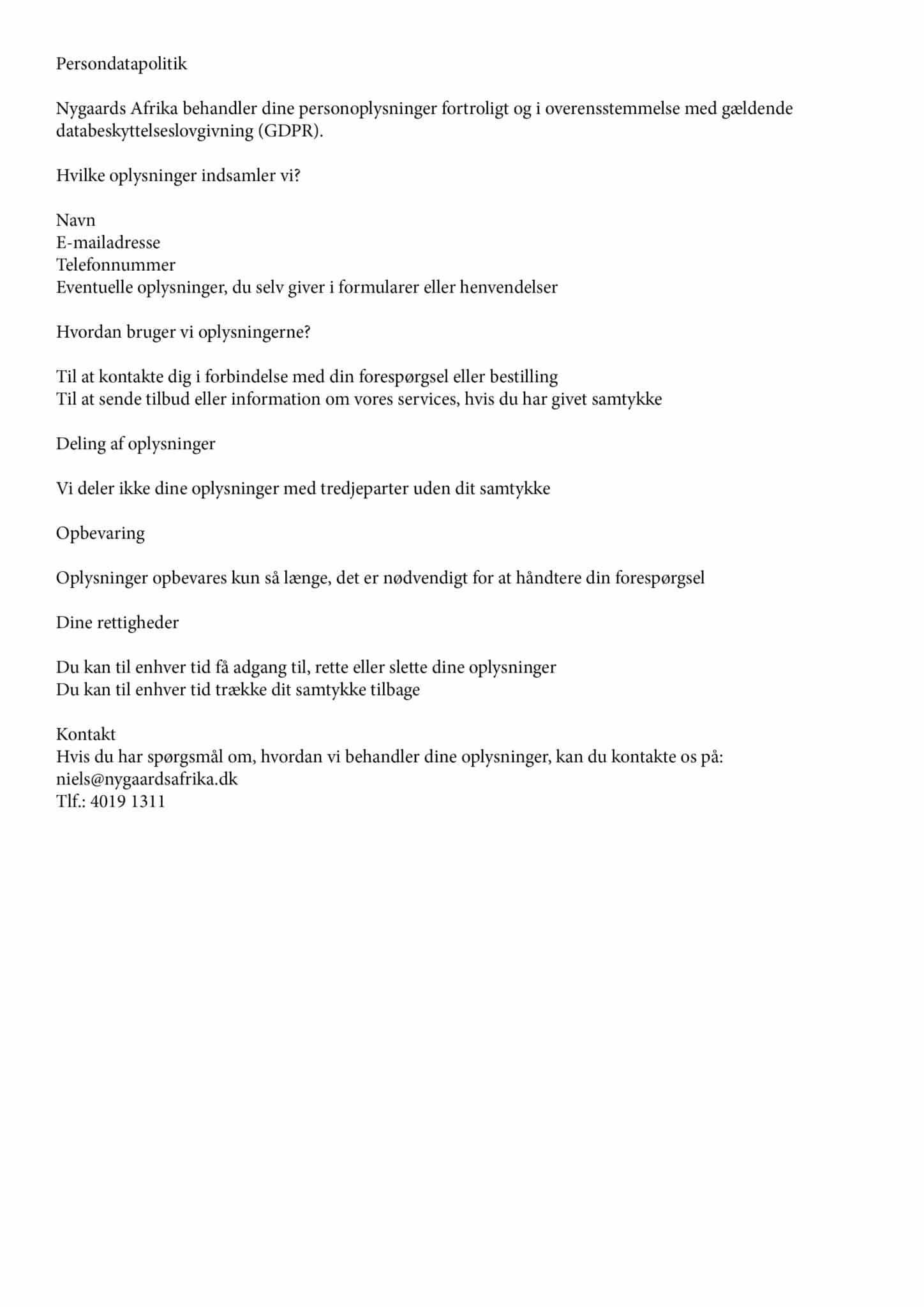 Ring til os på telefon +45 40 19 13 11 eller send en mail til niels@nygaardsafrika.dk. Vi besvarer din henvendelse hurtigst muligt.